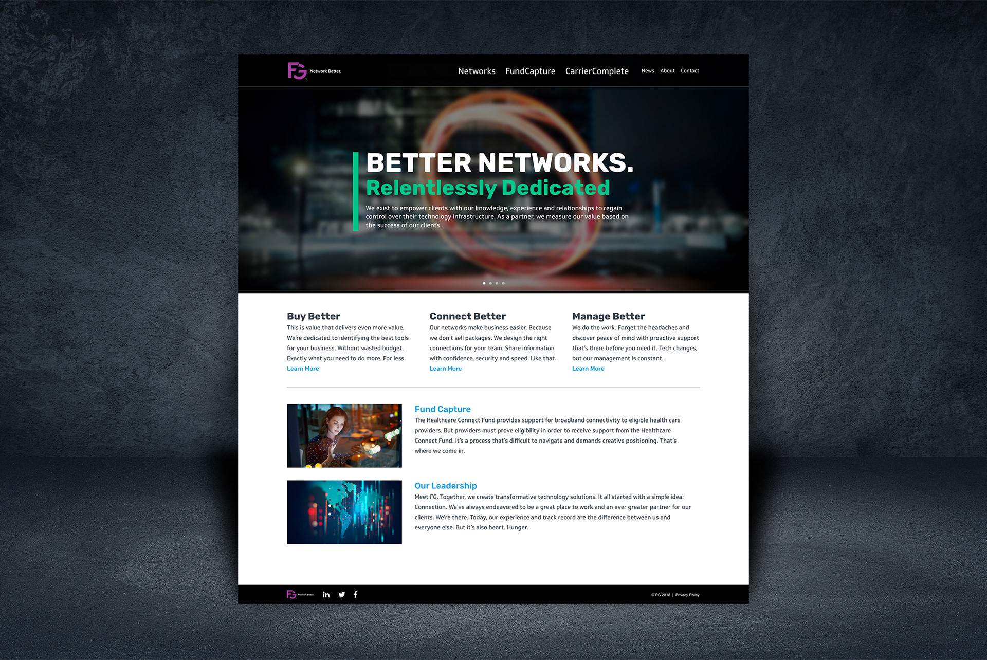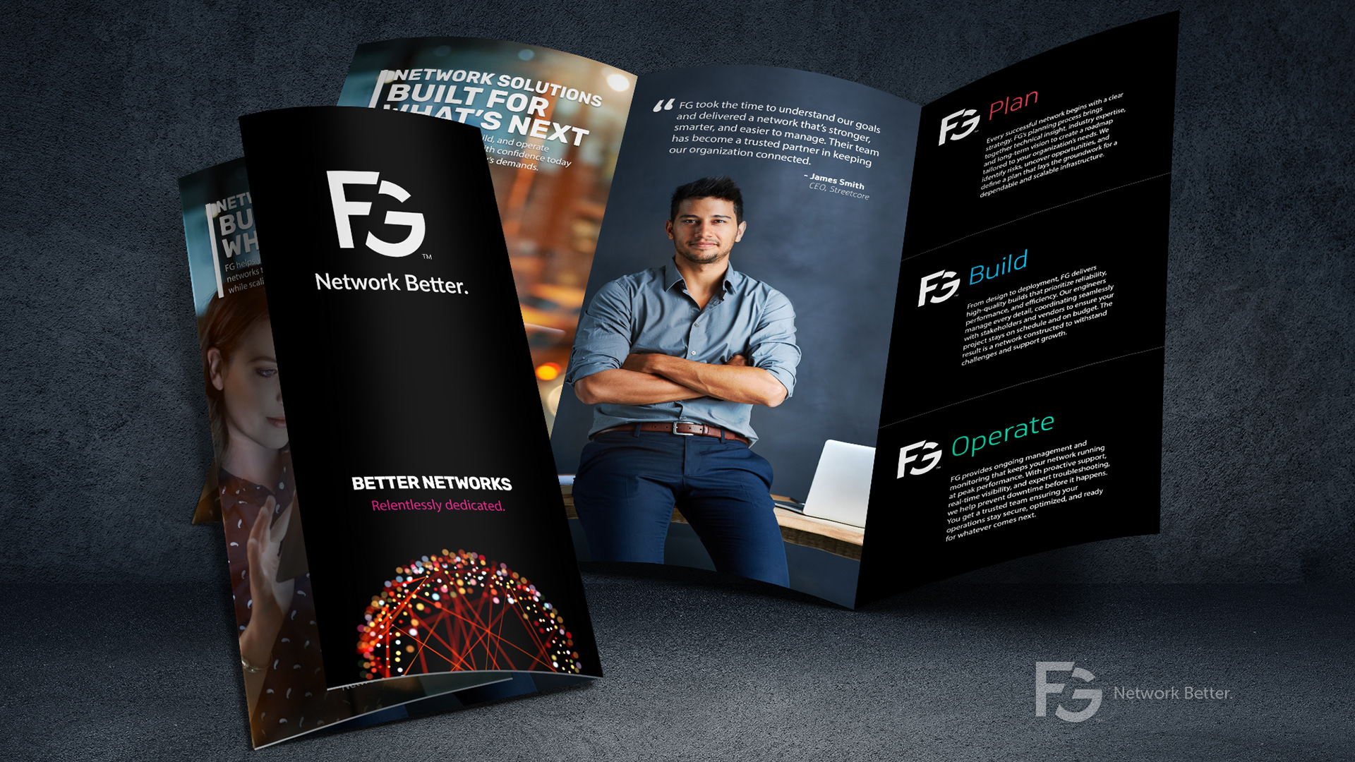 As Senior Art Director, I led the full rebranding of FiberUtilities Group as they transitioned to their streamlined identity, FG. My role spanned concept development through final delivery, guiding the leadership team as we reshaped their visual language and strategic position. I designed the new logo, built a modern website that emphasized clarity and energy, and authored a cohesive brand guide to support consistent use across all touchpoints. Introduced through the Broadband Together concept and the Network Better tagline, the refreshed identity highlighted FG’s role in strengthening essential networks for healthcare, education, and public institutions. The rebrand provided a sharper market presence and a unified foundation for future growth.