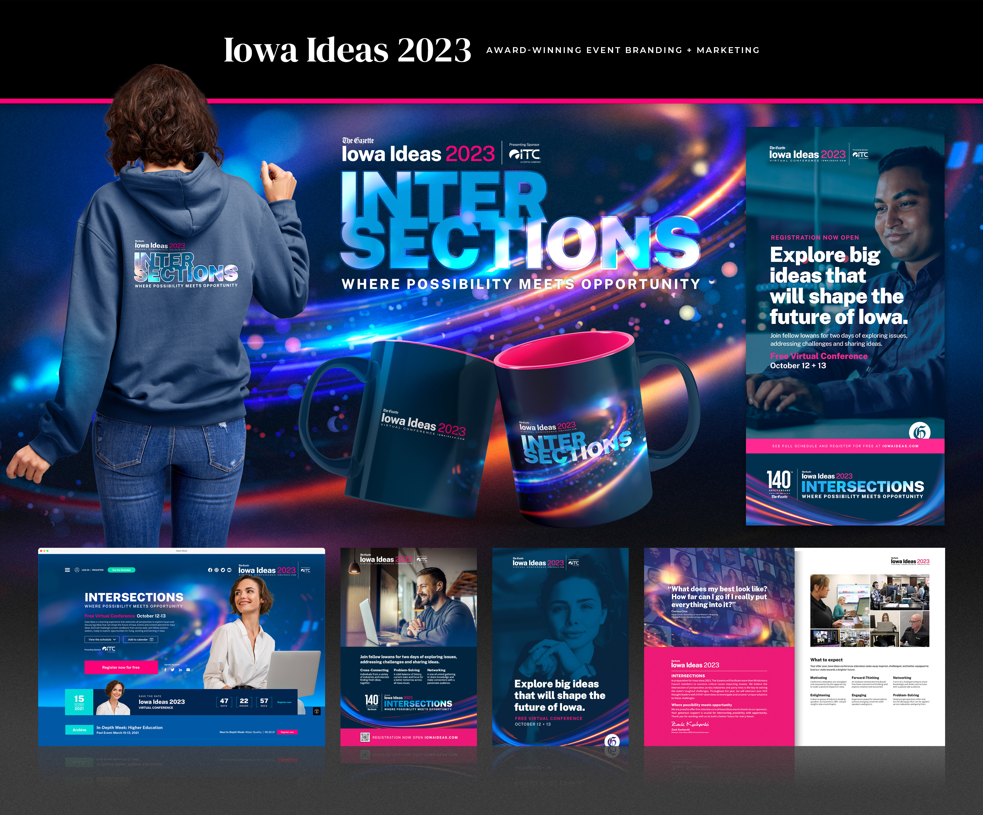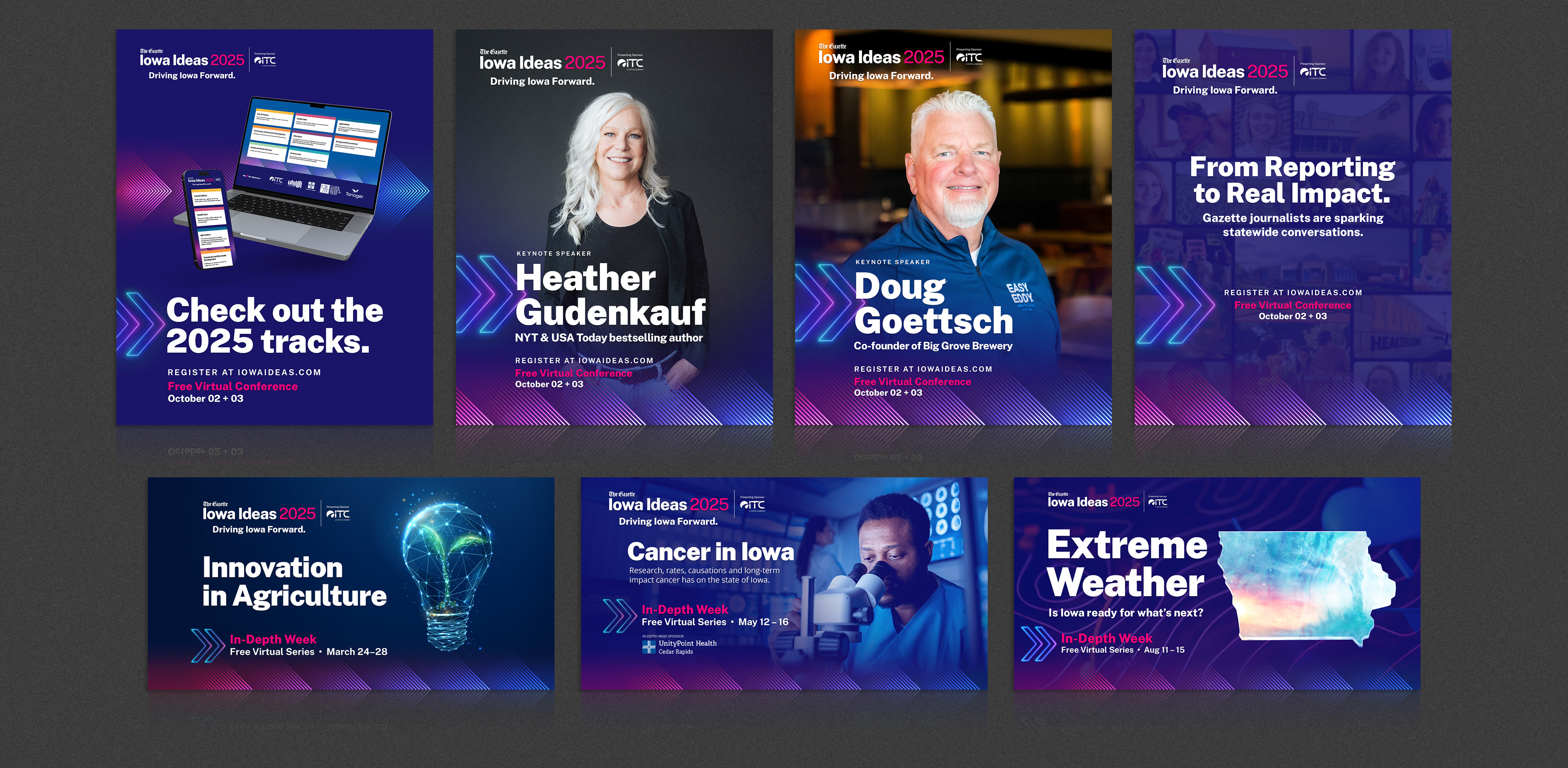 As Creative Director, I led the complete rebranding of the Iowa Ideas Conference, transforming it into a statewide annual event with a distinct thematic identity that audiences could anticipate year after year. I developed the visual framework, messaging platform, and creative strategy that shaped every touchpoint of the conference, from advertising and social media to video content, session graphics, and web design. My work included hands-on design, copywriting, motion graphics, and video production, as well as cross-department collaboration with editorial teams to support their content needs.