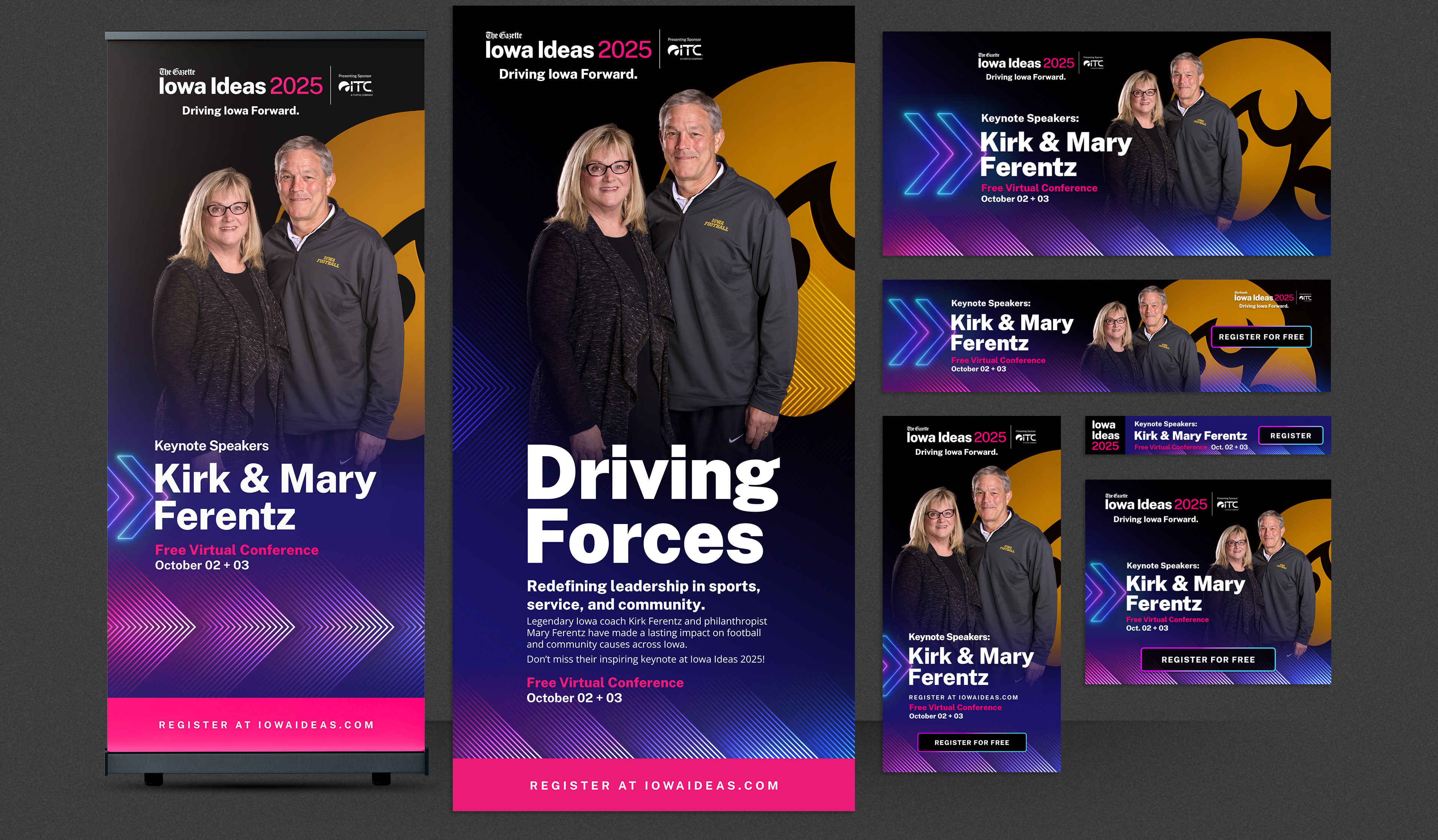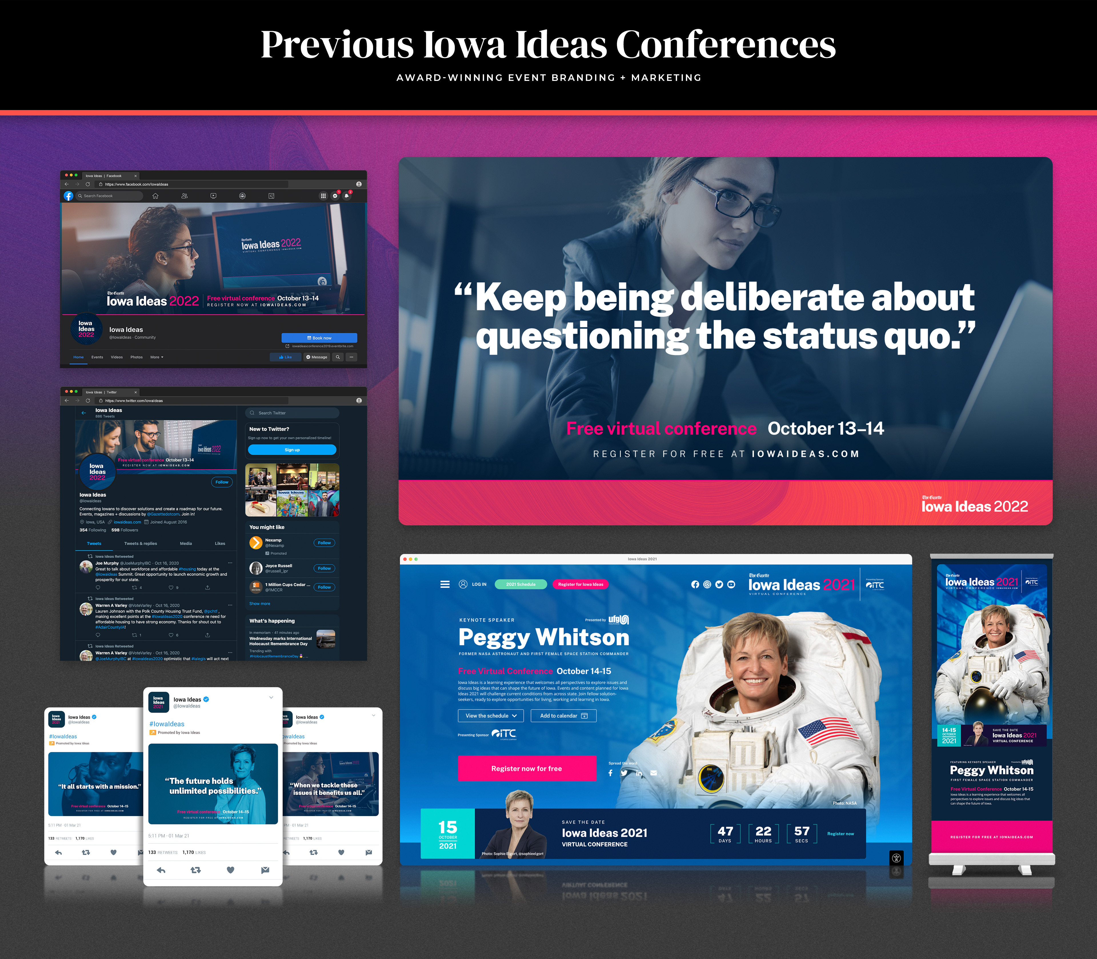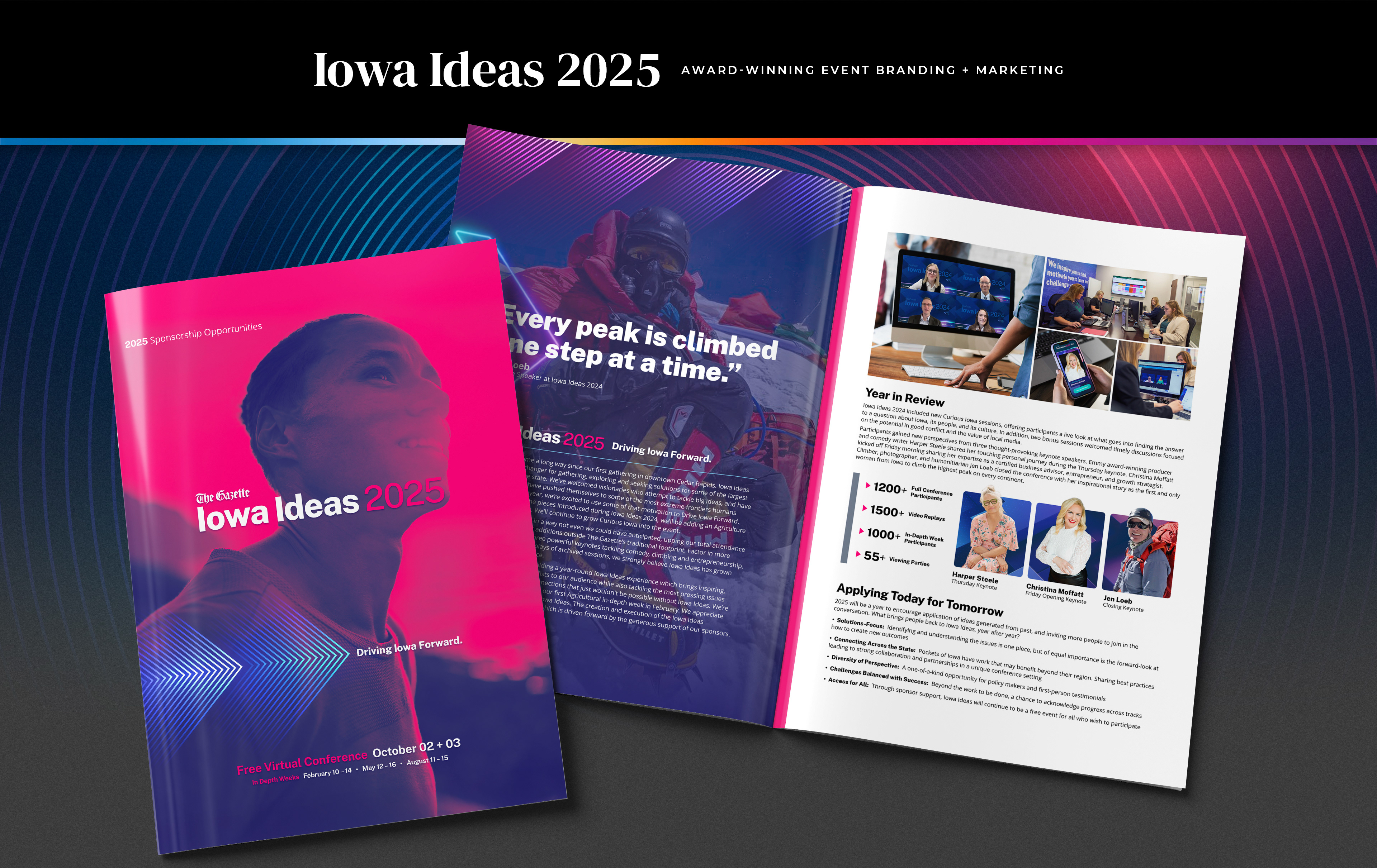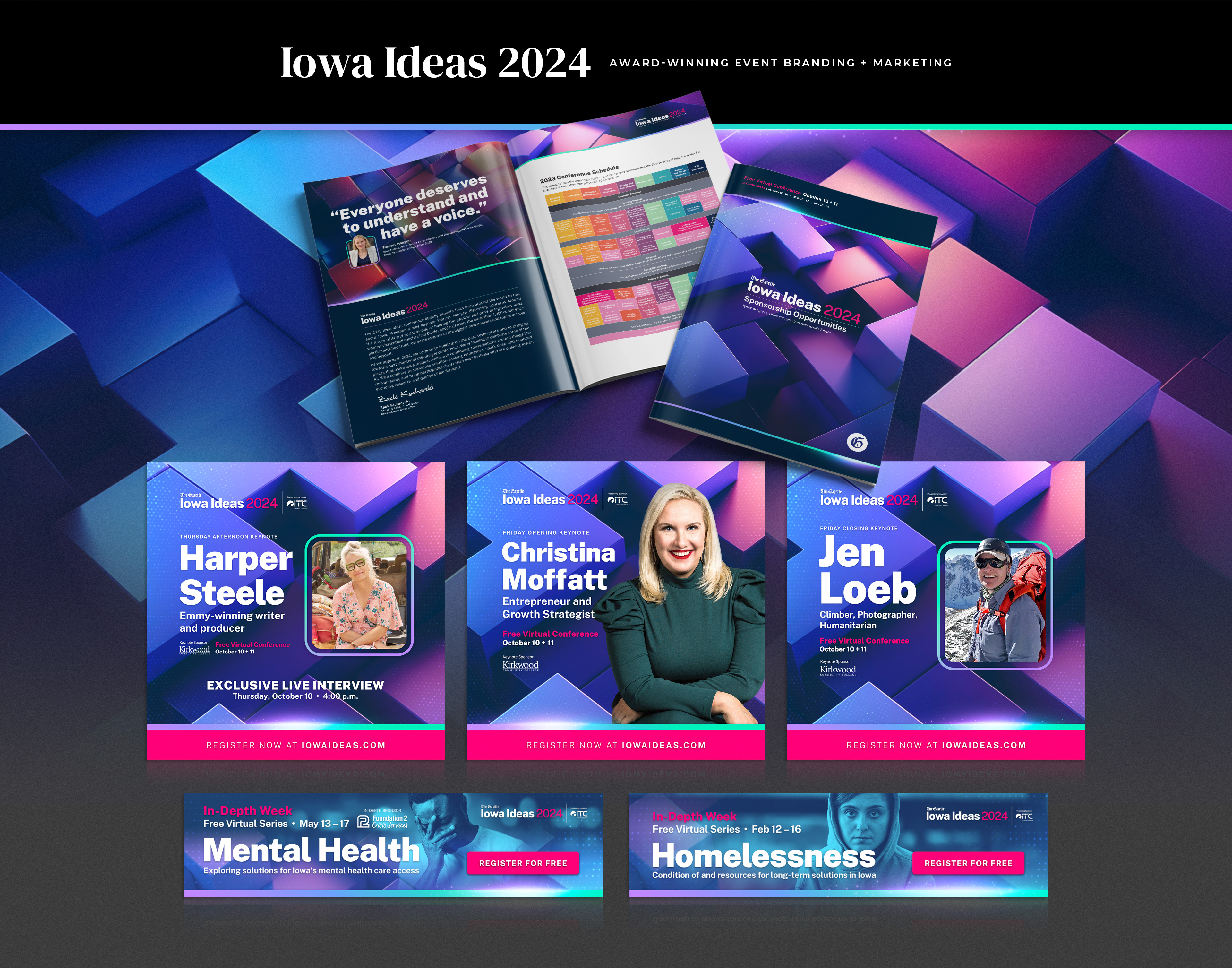 When the event shifted to a virtual format, I introduced new design approaches that enhanced the digital experience and expanded accessibility. The refreshed brand and integrated campaigns contributed to record participation and increased annual sponsorship revenue, solidifying Iowa Ideas as a trusted statewide forum for meaningful civic dialogue.