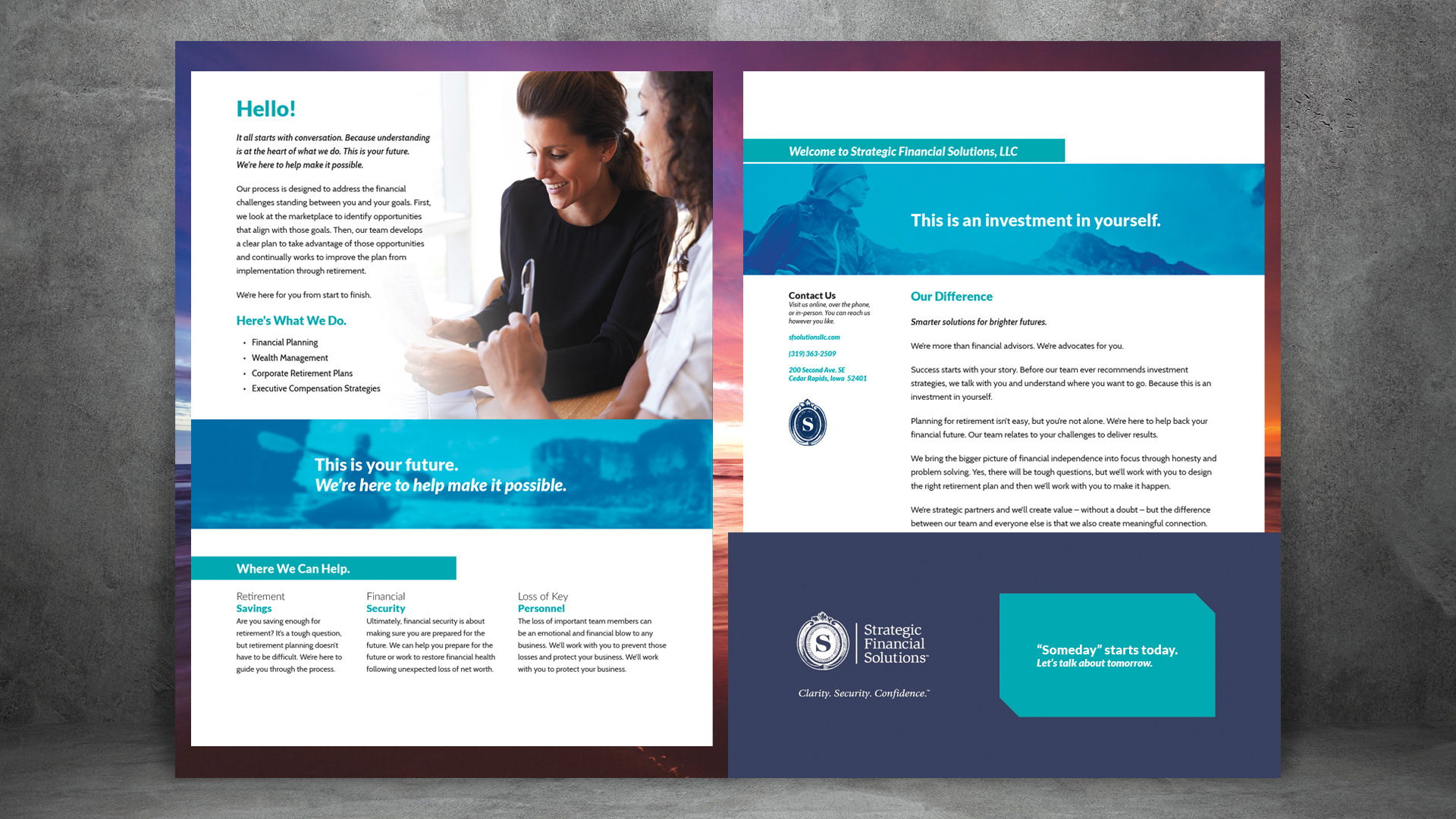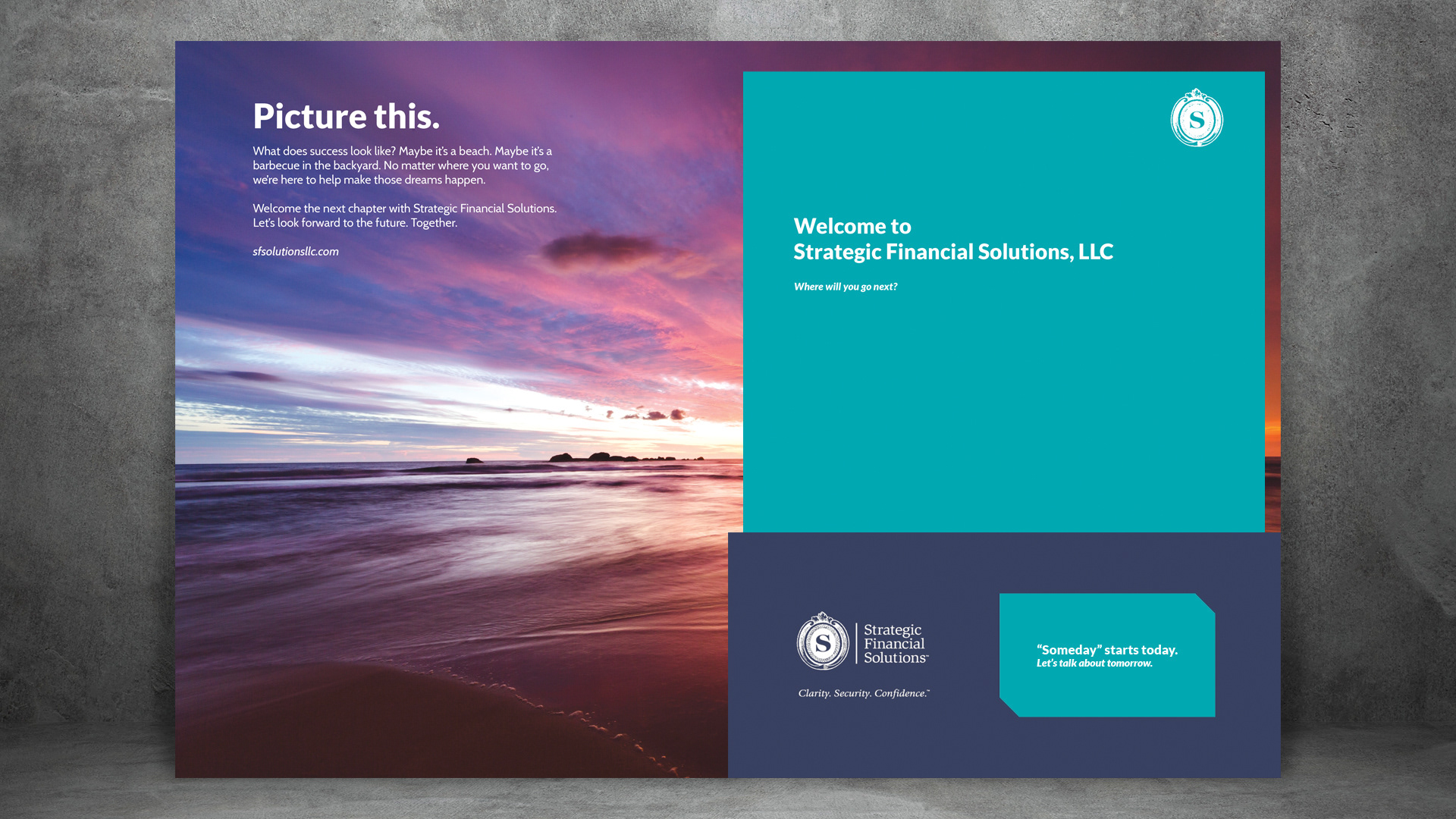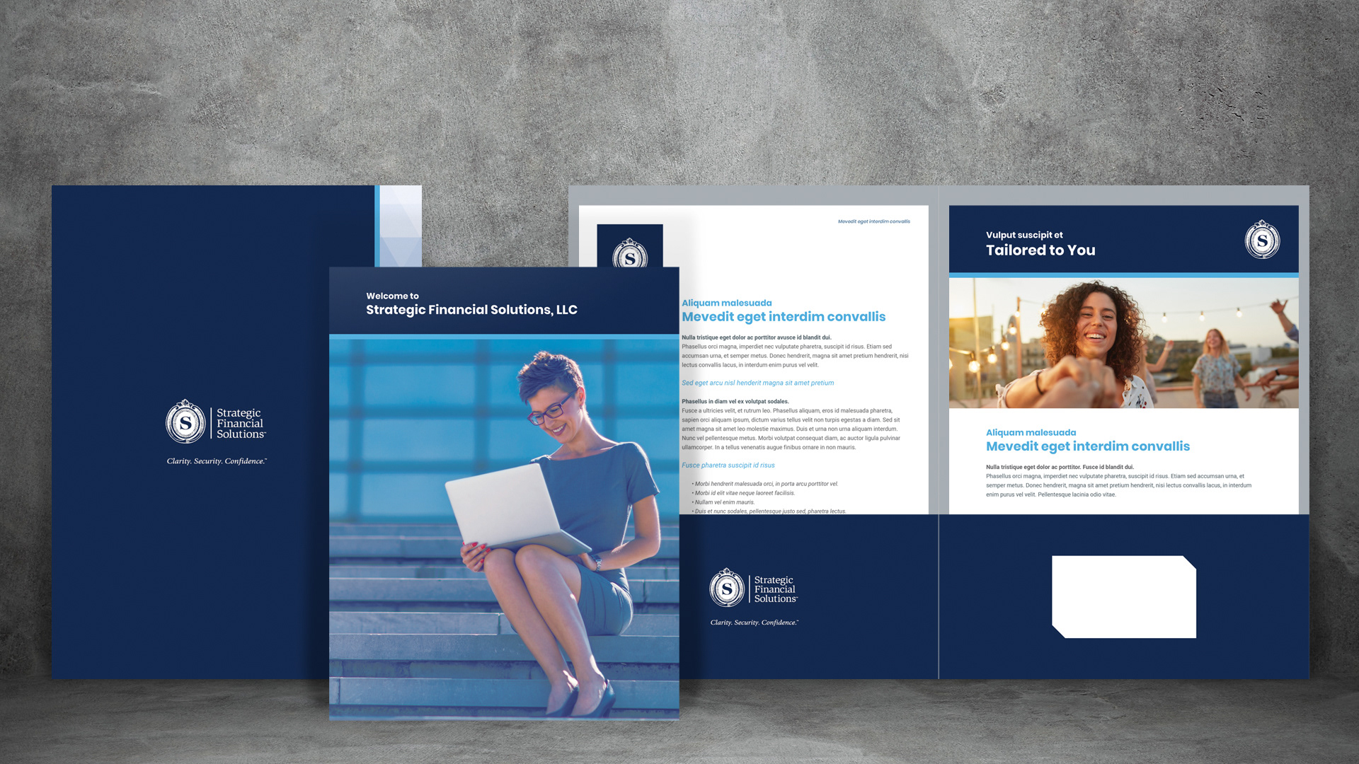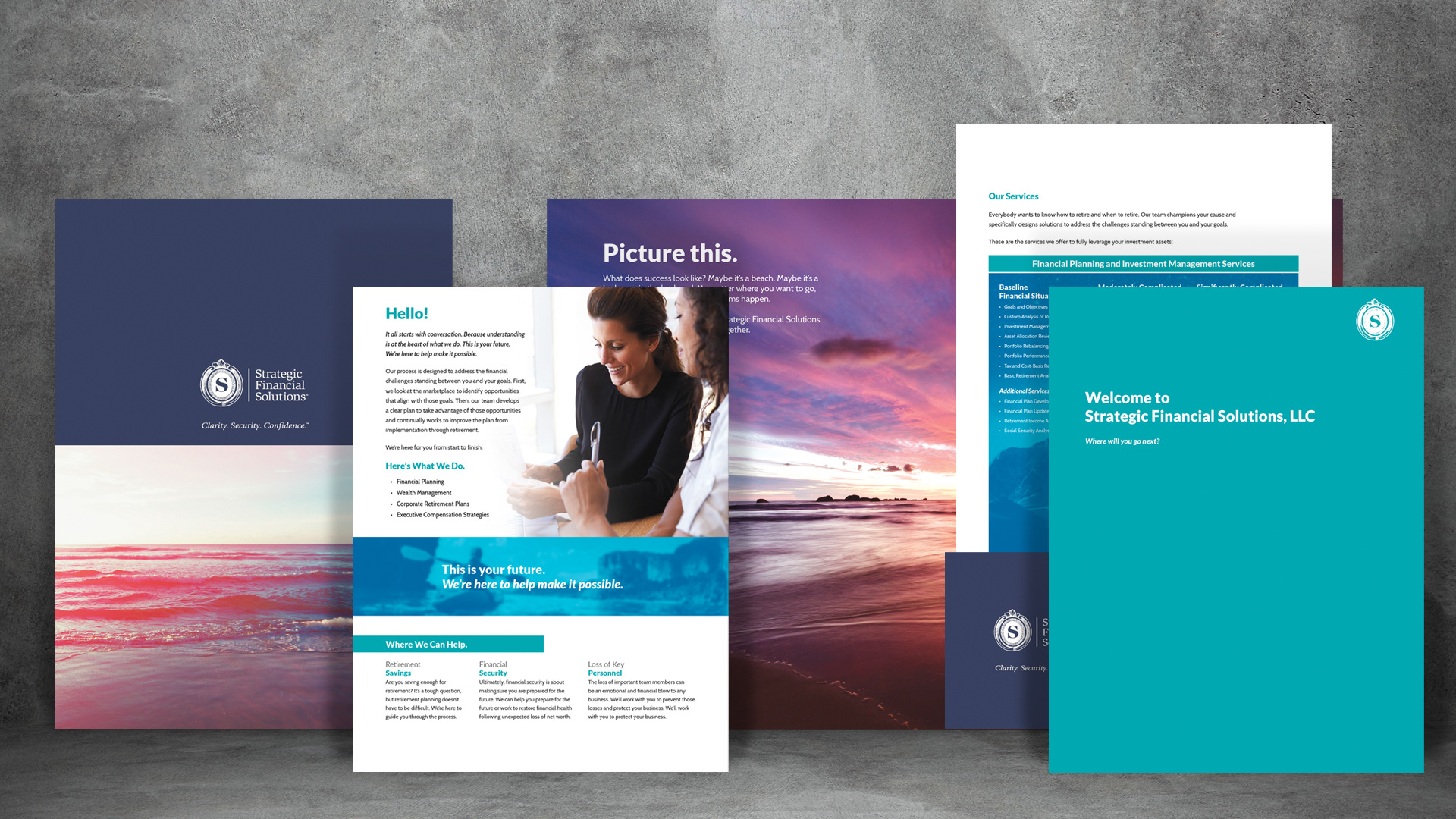 As Senior Art Director, I led a complete redesign of collateral materials used by Strategic Financial Solutions, focusing on clarity, usability, and visual cohesion across multiple audience groups. To ground the work in shared purpose, I facilitated a brand workshop with SFS leadership that helped define their values, communication goals, and internal culture. Using these insights, I created a suite of printed resources that transformed complex information into approachable, well-organized materials. The updated collateral expressed a unified brand voice and provided administrators and end users with tools that were both practical and engaging. The project strengthened SFS’s professional presence and elevated the way they communicate their services.